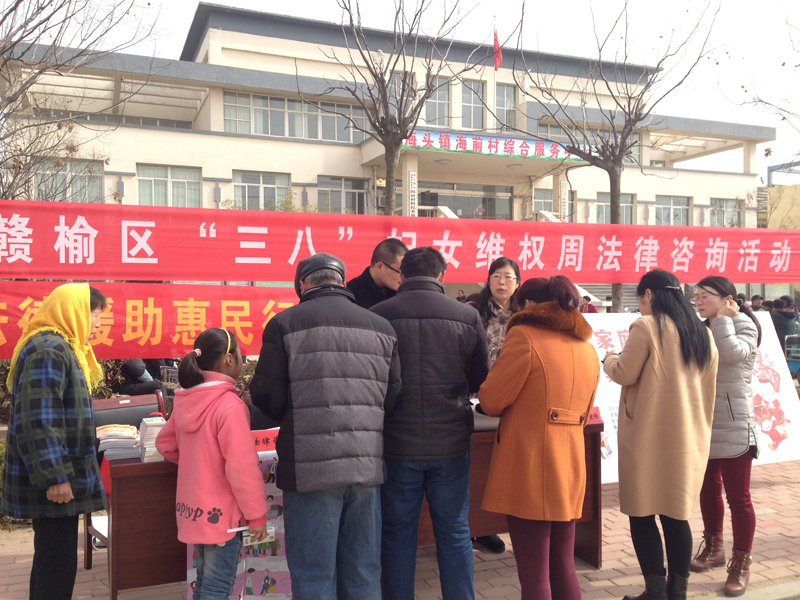 3月6日,赣榆区司法局联合区妇联组织女律师、女公证员、女法律援助工作者等,来到海头镇海前村集贸市场,向村民宣传反家暴法、妇女权益保障法等法律知识,为村民免费发放《妇女权益保障法》、《常用法律知识100问》、《法律进家庭》等宣传材料,现场为村民提供法律咨询并受理妇女维权法律援助,帮助妇女增强法律意识,提高妇女依法维权能力,活动受到当地群众广泛欢迎。